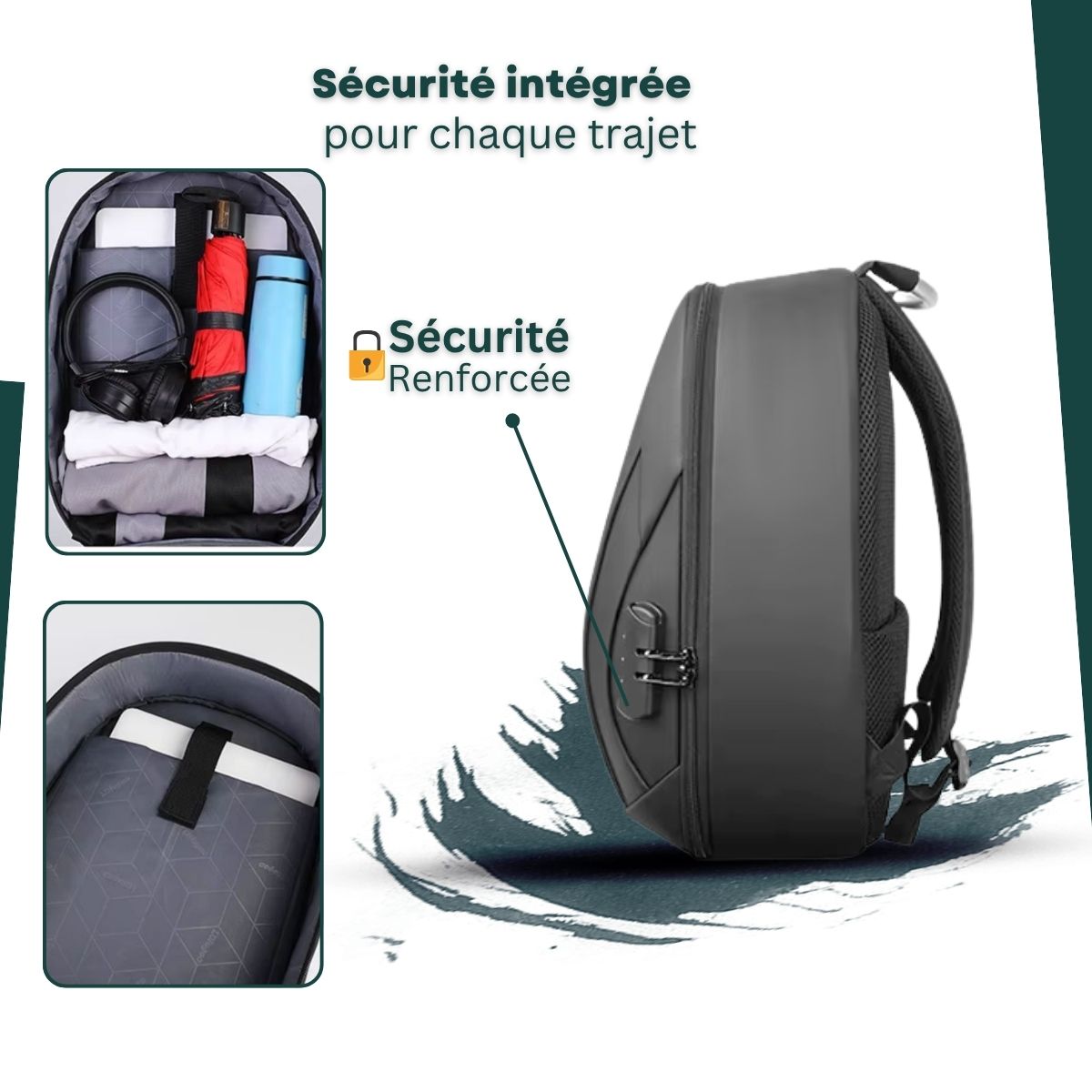• Tranquillité d’Esprit : Ce mécanisme discret et efficace ajoute une couche supplémentaire de sécurité, essentielle si vous transportez du matériel de valeur comme un ordinateur portable.